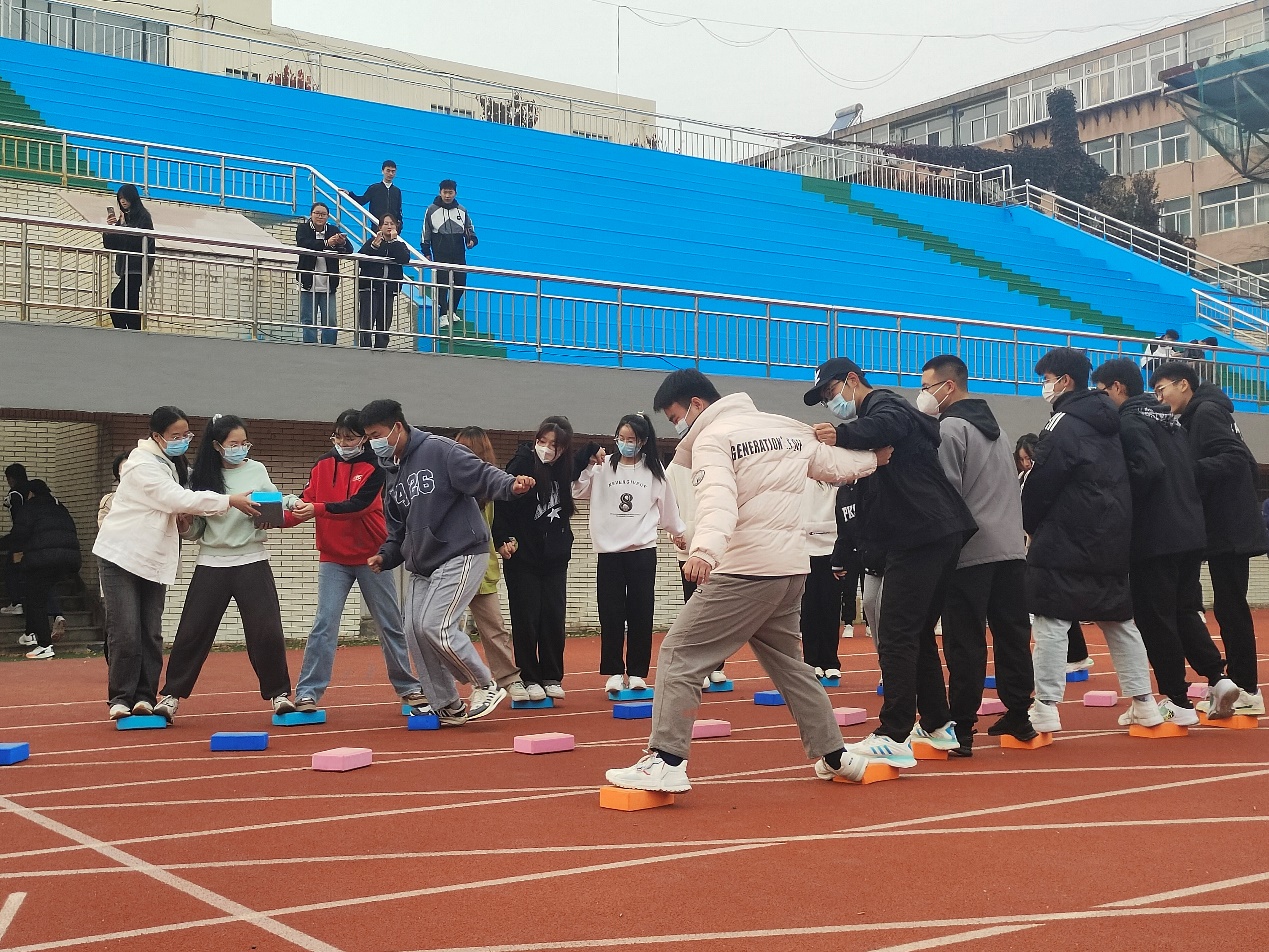 心理趣味运动会设置“无敌风火轮”,“过河搭桥”,“地雷战”等比赛项目。“无敌风火轮‘’由三支队伍同时进行比赛,团队中成员合力站在风火轮上向前移动,走过指定距离用时最短的队伍获胜;而“过河搭桥”每次比赛4支队伍同时进行,每组分得8块道具砖,由第一名队员向前搭放道具砖,最后一名队员不断地把身后的道具砖向前传给第一个队员,前进30米,每队最后一名参赛队员身体越过终点线为比赛完成;“地雷战”每次比赛6支队伍同时进行。比赛开始后,每支队伍两名队员在指定位置进行现场指挥,一名队员带上眼罩听从指挥前行,三人都依次穿过地雷阵后比赛结束。
