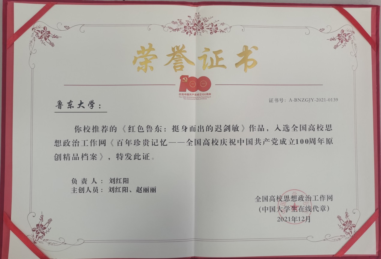 近日,全国高校思想政治工作网开展的“高校庆祝中国共产党成立100周年原创精品推广行动”遴选结果揭晓,我校农学院作品《红色鲁东:挺身而出的迟剑敏》成功入选全国高校思想政治工作网《百年珍贵记忆——全国高校庆祝中国共产党成立100周年原创精品档案》,该作品是全省入选的6部作品之一。