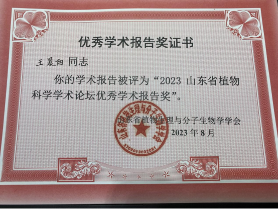 近日,由山东省植物生理与分子生物学学会主办的“2023山东省植物科学学术论坛”在临沂大学召开,美高梅农艺与种业专业二年级研究生王晨阳应邀在研究生专题报告中做了《基于小麦超高密度一致性整合图谱穗粒数遗传基础解析》学术报告,并被评为“2023山东省植物科学学术论坛优秀学术报告奖”。