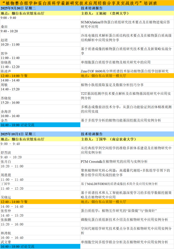 培训班将于2025年9月30号在山东烟台东山宾馆召开,相关准备工作正在进行,热烈欢迎大家积极报名参加。截止2025年8月20日晚上12点止,目前已经邀请到17位技术专家为大家做培训专题讲座,目前确定的培训题目包括:蛋白质组学:植物互作研究的“显微镜”与“指南针”,SUMOylation修饰蛋白质组研究技术要点及在植物逆境应答研究中应用,冷冻电镜技术解析蛋白质结构技术要点及在植物蛋白质高级结构解析中应用实例分享,基于质谱成像的植物蛋白质组研究技术要点及新策略实战分享,T2T基因组测序技术要点解析及在植物基因组研究中应用实例分析,ZenoTOF 8600高分辨质谱技术驱动植物蛋白组学创新研究,基于MALDI和DESI的质谱成像技术简介及在植物蛋白质组研究中应用实例分析,磷酸化蛋白质组新技术介绍及在植物研究中应用实例分析,单细胞蛋白质组学在植物及相关研究中的应用,空间代谢组学研究技术要点分享及在植物研究中应用实例分析,基于多组学分析的植物功能基因挖掘及应用实例分析,五新技术助力植物多组学研究--“新技术-新物质-新通路-新基因-新功能”,单细胞空间多组学联合分析及在植物研究中应用实例分析,聚焦植物研究核心利器:高通量代谢组+多肽组学引领下的整合组学应用实战技能分享,空间多组学研究技术要点分享及在植物研究中应用实例分析,基于质谱技术和人工智能机器深度学习的多组学数据挖掘策略及在植物研究中应用,从经典组学到空间组学的准稳多新体系建设及在植物研究中应用实例分析,PTM Crosstalk在植物研究的应用与实例分析,植物小肽组提取鉴定及数据分析技巧分享及饮用实例分析,植物成像技术应用技巧及在植物组学研究中应用实例分析等内容。