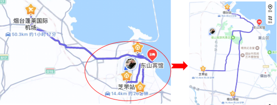 交通:黄海宾馆位于莱山区滨海中路7号,离主会场480米,步行约7分钟;距离烟台站6.4公里,打车约15分钟;距离烟台南站14.7公里,打车约21分钟;距蓬莱国际机场52.2公里,打车约1小时11分钟。