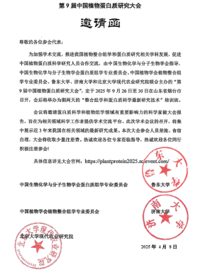为了加强学术交流,促进我国植物整合组学和蛋白质研究相关学科发展,推进中国蛋白质科学新高地建设步伐,由中国生物化学与分子生物学会指导,中国生物化学与分子生物学会蛋白质组学专业委员会、中国植物学会植物整合组学专业委员会、鲁东大学、济南大学和北京大学现代农业研究院联合主办,鲁东大学园艺学院、鲁东大学农林工程研究院、济南大学生物科学与技术学院、山东师范大学生命科学学院、临沂大学农林科学学院等单位共同承办的“第9届中国植物蛋白质研究大会”,定于2025年9月26日至30日在山东省烟台市东山宾馆召开,会后还将举办为期两天的“植物整合组学和蛋白质科学最新研究技术应用经验分享及实战技巧”培训班。