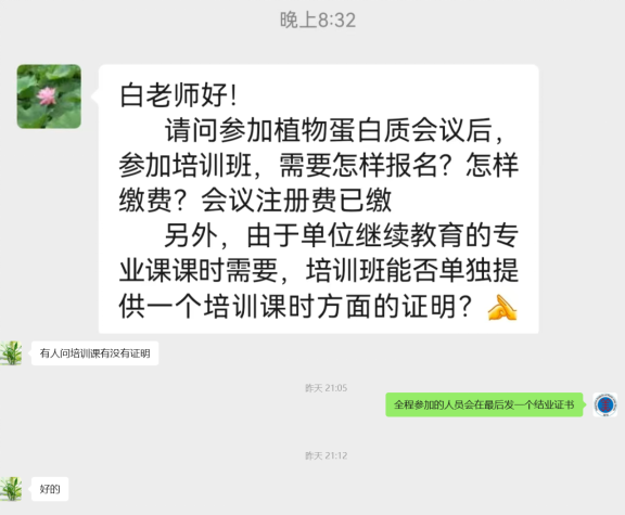 关于培训班报名及结业证书的事情,如截图,不断有人问会务组相关老师,在此,做一个统一回复:欢迎大家积极报名参加会后为期两天的第4届 “植物整合组学和蛋白质科学最新研究技术应用实战技巧”培训班,培训班控制人数在300人之内,只有参加注册参会的正式代表,才能继续报名注册参加后续的培训班,大会注册缴费网址:https://plantprotein2025.scievent.com/hui-yi-zhu-ce/9235.html